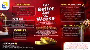 For Better and Worse explores the realities of marriage beyond the ceremony. Featuring couples, therapists, divorce attorneys, and faith leaders, the series examines how commitment is tested by finances, communication, trauma, and expectations — and how marriage impacts families and communities over time.
